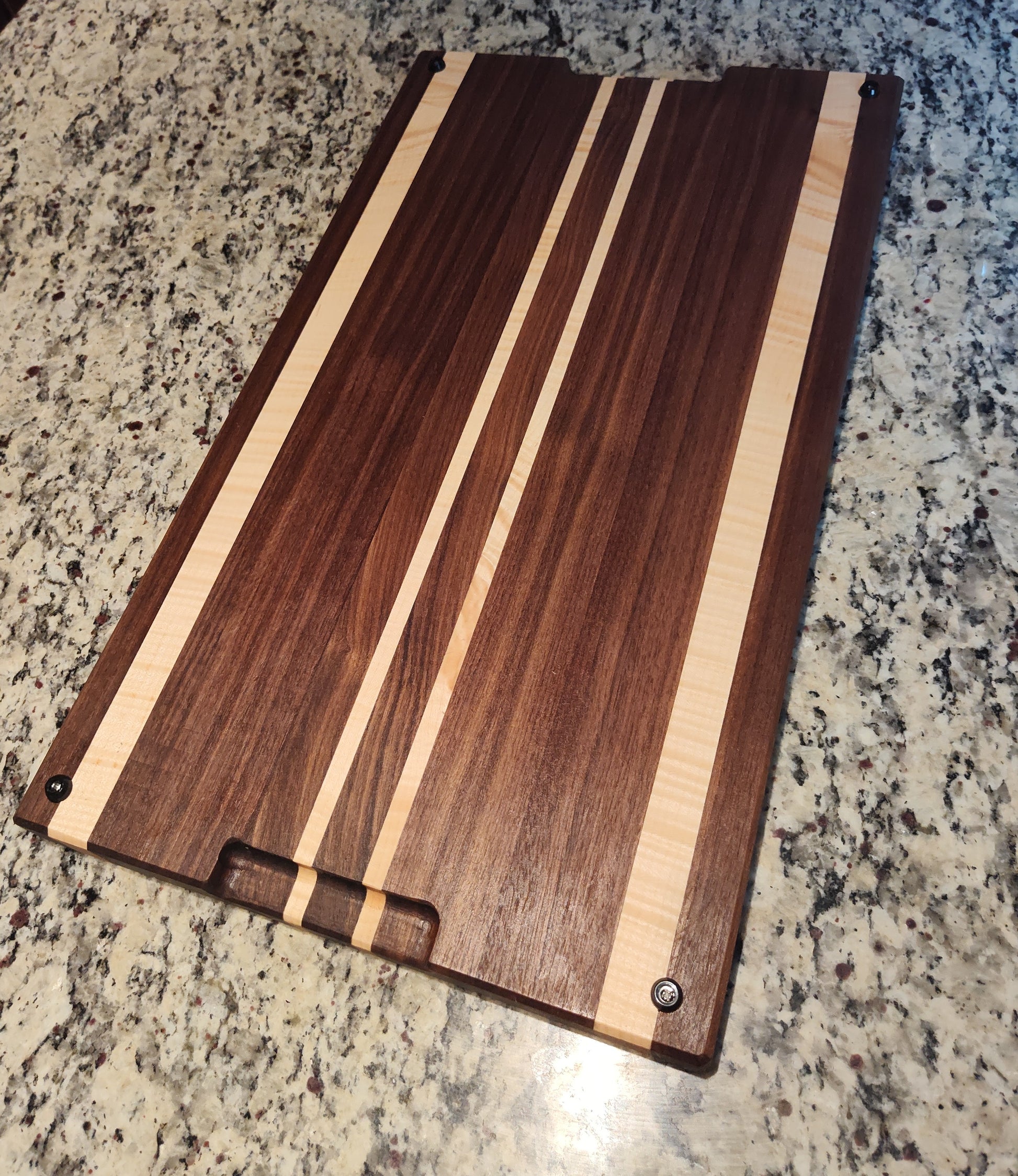 Juice groove optional on one side. No feet on the other side so you can use either side.